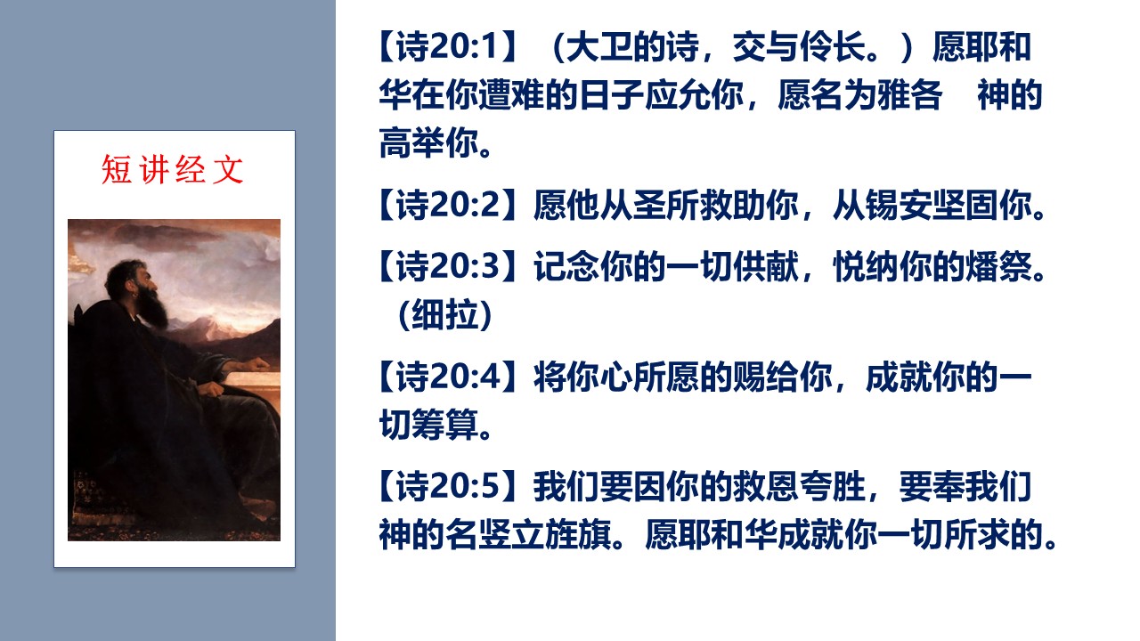 诗篇20篇,是大卫写的一篇极美的祈祷诗。在这首诗歌中,我们能看见上帝的哪些心意?