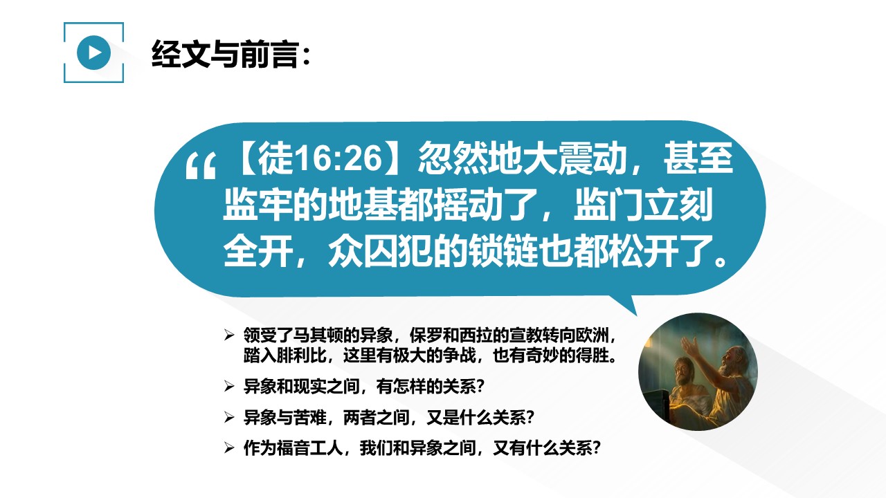 领受了马其顿的异象,保罗和西拉的宣教转向欧洲,踏入腓利比,这里有极大的争战,也有奇妙的得胜。