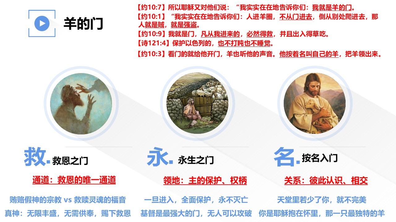 当耶稣说“我是羊的门”,给我们哪三个重要的真理启示?
