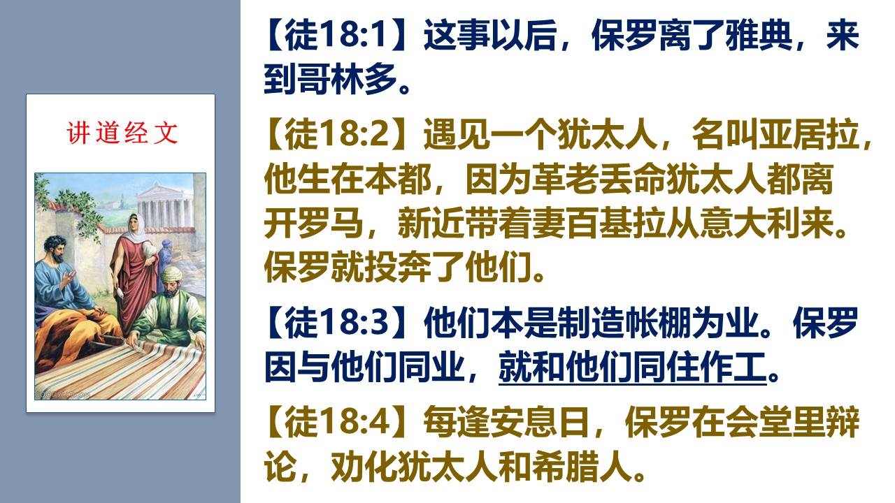 宣教使者保罗,很自然地与亚居拉、百基拉夫妇一起织帐篷,圣经记载这个故事,必有深意。