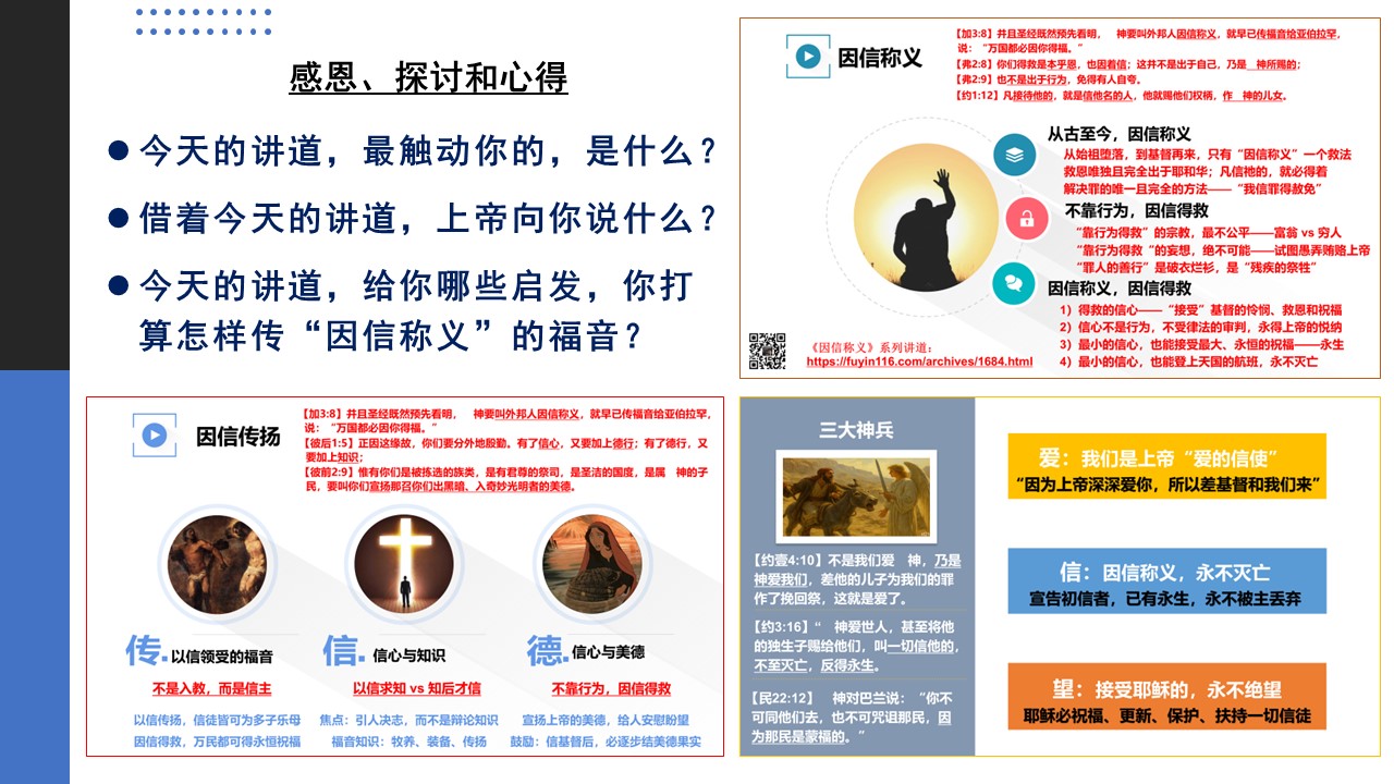 也强烈建议大家花时间听我们的《因信称义》系列讲道,必能让你茅塞顿开,充满力量和信心,去广传福音: