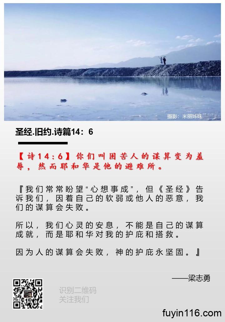 【诗14:6】你们叫困苦人的谋算变为羞辱,然而耶和华是他的避难所。” 《不求心想事成,单靠主的庇佑》 作于2020年6月 作者:梁志勇牧师 朗诵:徐辉姊妹 【诗14:6】你们叫困苦人的谋算变为羞辱,然而耶和华是他的避难所。 『我们常常盼望“心想事成”,但《圣经》告诉我们,因着自己的软弱或他人的恶意,我们的谋算会失败。 所以,我们心灵的安息,不能是自己的谋算成就,而是耶和华对我的护庇和搭救。 因为人的谋算会失败,神的护庇永坚固。』 救主耶稣基督,我们感谢和赞美你 感谢你,因着你在十字架上替我们成为罪,担当我们一切的过…