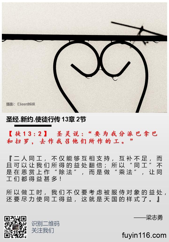 【徒13:2】 圣灵说:“要为我分派巴拿巴和扫罗,去作我召他们所作的工。” 《为何要一同做工?》 作者:梁志勇牧师 朗诵:倩文师母 为何要一同做工? (梁志勇) 【徒13:2】 圣灵说:“要为我分派巴拿巴和扫罗,去作我召他们所作的工。” 我们在圣经中不断看到“同工”的原则,不仅有这里圣灵差遣巴拿巴和保罗,还有主耶稣差遣门徒,总是“两个两个地出去”,智者所罗门说“两个人总比一个人好,因为二人劳碌同得美好的果效。”(传4:9) 按照所罗门的讲解,二人同工,不仅能够互相支持,互补不足,而且可以让我们所得的益…