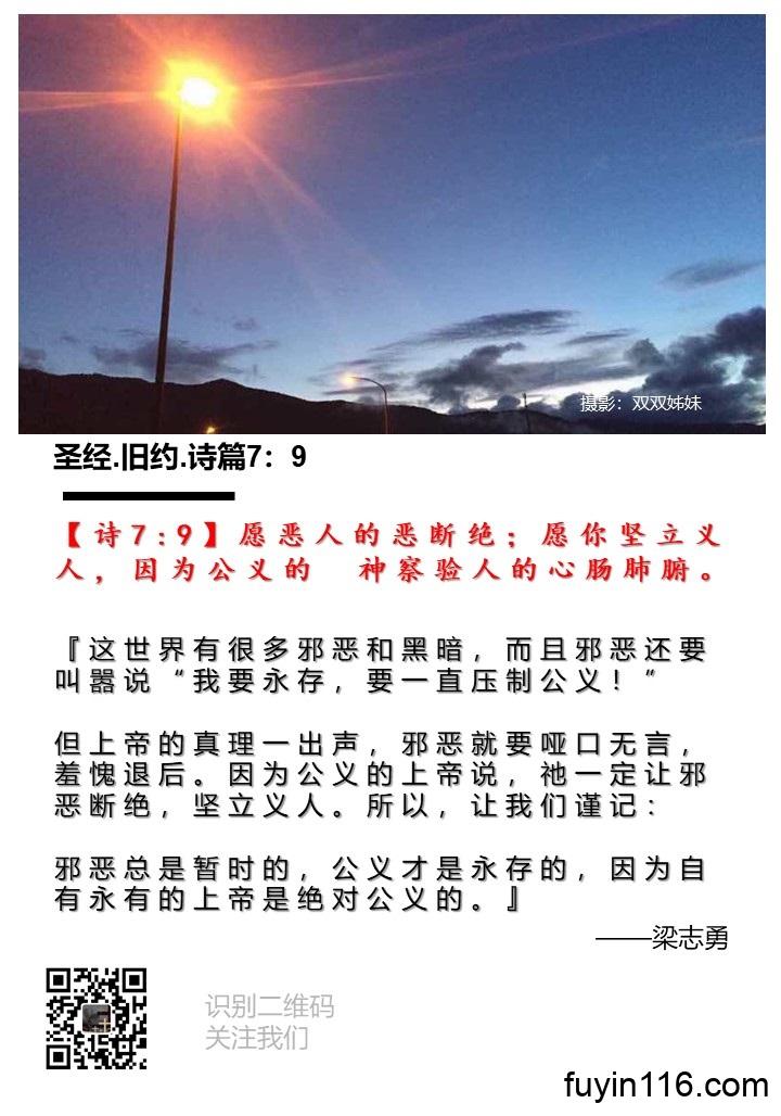 【诗7:9】愿恶人的恶断绝;愿你坚立义人,因为公义的 神察验人的心肠肺腑。   《什么最长久?》 作者:梁志勇牧师 朗诵:徐辉姊妹 【诗7:9】愿恶人的恶断绝;愿你坚立义人,因为公义的 神察验人的心肠肺腑。 『这世界有很多邪恶和黑暗,而且邪恶还要叫嚣说“我要永存,要一直压制公义!” 但上帝的真理一出声,邪恶就要哑口无言,羞愧退后。 因为公义的上帝说,祂一定让邪恶断绝,坚立义人。 所以,让我们谨记:邪恶总是暂时的,公义才是永存的,因为自有永有的上帝是绝对公义的。』 我们在天上的父…