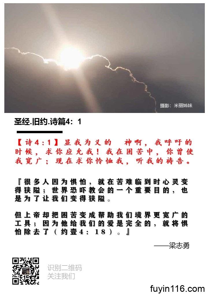 【诗4:1】显我为义的 神啊,我呼吁的时候,求你应允我!我在困苦中,你曾使我宽广;现在求你怜恤我,听我的祷告。 《怎样在苦难中,反而变得宽广?》 作者:梁志勇牧师 朗读:徐辉姊妹 【诗4:1】显我为义的 神啊,我呼吁的时候,求你应允我!我在困苦中,你曾使我宽广;现在求你怜恤我,听我的祷告。 『很多人因为惧怕,就在苦难临到时心灵变得狭隘;世界恐吓教会的一个重要目的,也是为了让我们变得狭隘。 但上帝却把困苦变成帮助我们境界更宽广的工具;因为他给我们的爱是完全的,就将惧怕除去了(约壹4:18)。』 亲爱的天…